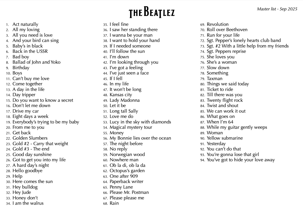 Below is The Beatlez master song list. We pride ourselves on being able to cater for casual fans who love the ‘greatest hits’ and just want to twist and shout, as well as the die-hards who love to take mystery tour further down Penny lane for the deeper album cuts and even a few B-Sides.